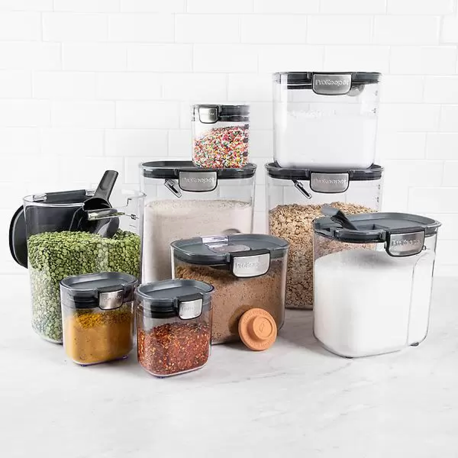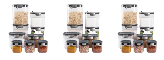 The FreshSeal 9-Pieces Clear Kitchen Container Set includes storage containers for flour, granulated sugar, brown sugar, powdered sugar, coffee and a mini keeper. Each FreshSeal features its own specialized, integrated tool. This set includes six stackable food storage containers with easy-catch lids and silicone seals for airtight storage to keep your kitchen organized and your food fresher longer.