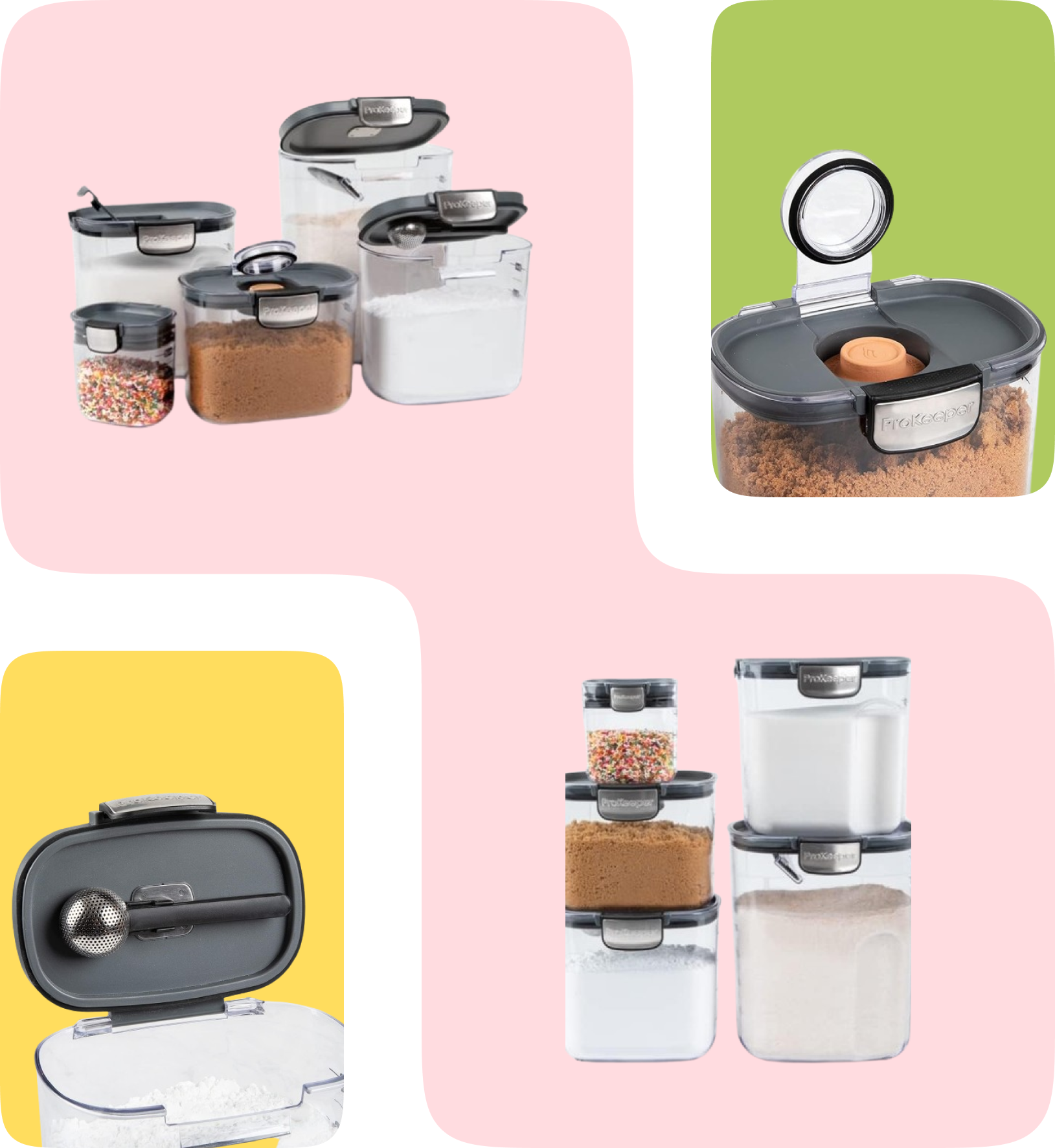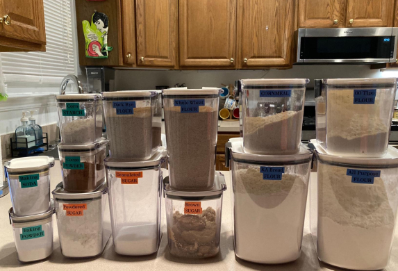 Includes a canister for flour, granulated sugar, brown sugar, powdered sugar, and two versatile "mini" containers.